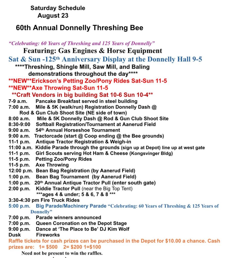 The Donnelly Threshing Bee kicks off tonight at 7:30 p.m. with Movie on the Grounds. Saturday will see a full day of activities, starting with a pancake breakfast from 7 to 9 a.m.; the Donnelly Dash 5K and Mile runs at 7 a.m. at the Rod and Gun Club Shooting Site; a softball tournament with registration starting at 8:30 a.m.; a horseshoe tournament at 9 a.m.; a Tractorcade at 9 a.m.; Kiddie Parade at 11 a.m.; Erickson’s Petting Zoo and Pony Rides from 11 a.m. to 5 p.m.; a Bean Bag tournament at 1 p.m.; the annual Antique Tractor Pull at 1 p.m.; the Kiddie Tractor Pull under the big tent at 2 p.m.; the Big Parade and Machinery Parade at 5 p.m.; Queen Coronation on the Depot Stage at 7 p.m.; a DJ at The Place to Be at 7 p.m.; and Fireworks at Dusk.