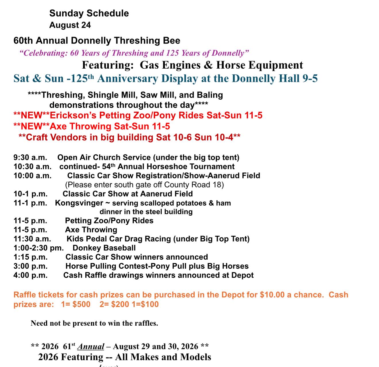 Sunday’s events include an open air church service under the big tent at 9:30 a.m.; a Classic Car Show from 10 a.m. to 1 p.m. on Aanerud Field; Donkey Baseball at 1 p.m.; and a Horse Pull Contest at 3 p.m.