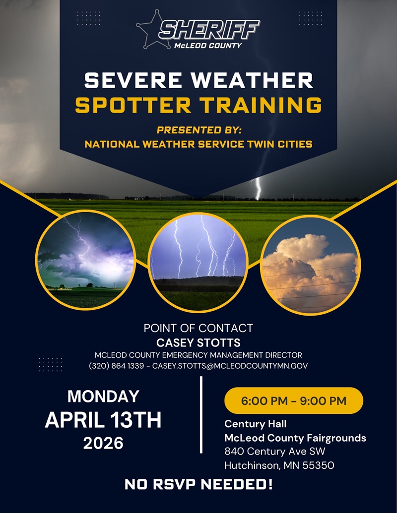 If you ever wanted to learn what to watch for during severe weather or if you need refresher training on spotter safety, McLeod County Emergency Management will be hosting the annual severe weather training on Monday, April 13th, 2026.