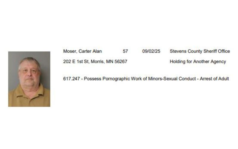On September 2, 2025, at approximately 3:30pm, the Stevens County Sheriff’s Office arrested Carter Alan Moser, age 57, of Morris, MN, on the following charges: Count I: Possess Pornographic Work; Minor under 14 Minnesota Statute: 617.247.4(b)(3), with reference to: 617.247.4(a), 617.247.4(b) Maximum Sentence: 10 years, $10,000 fine, or both Offense Level: Felony Count II: Possess […]