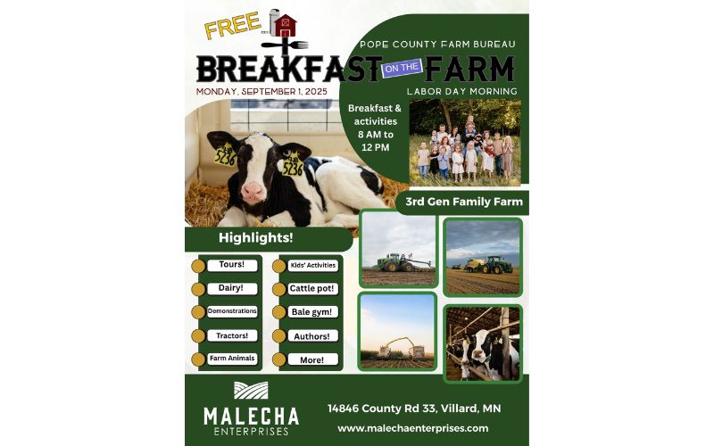 Pope County Farm Bureau’s Free Breakfast on the Farm event will be held from 8 a.m. to 12 p.m. Labor Day Monday at Malecha Enterprises Dairy in Villard. The event, hosted by the Farm Bureau and the Malecha Family, offers a farm-fresh breakfast, farm tours, hay rides, animals, kids’ activities, and educational booths. Breakfast is […]