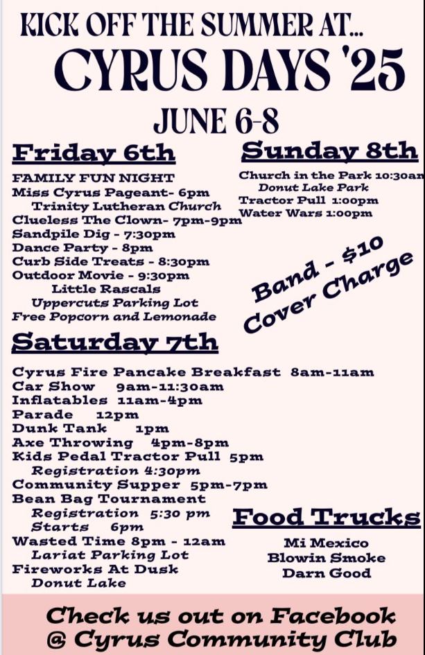 Cyrus Days will kick off the Summer Festival season this Friday through Sunday. Friday is Family Fun Night with the 6 p.m. Miss Cyrus Pageant at Trinity Lutheran Church, followed by Clueless the Clown and a 7:30 p.m. Sandpile Dig. The Dance Party begins at 8 p.m., with the Outdoor Movie, Little Rascals, showing in the Uppercuts parking lot at 9:30 p.m. with free popcorn and lemonade.