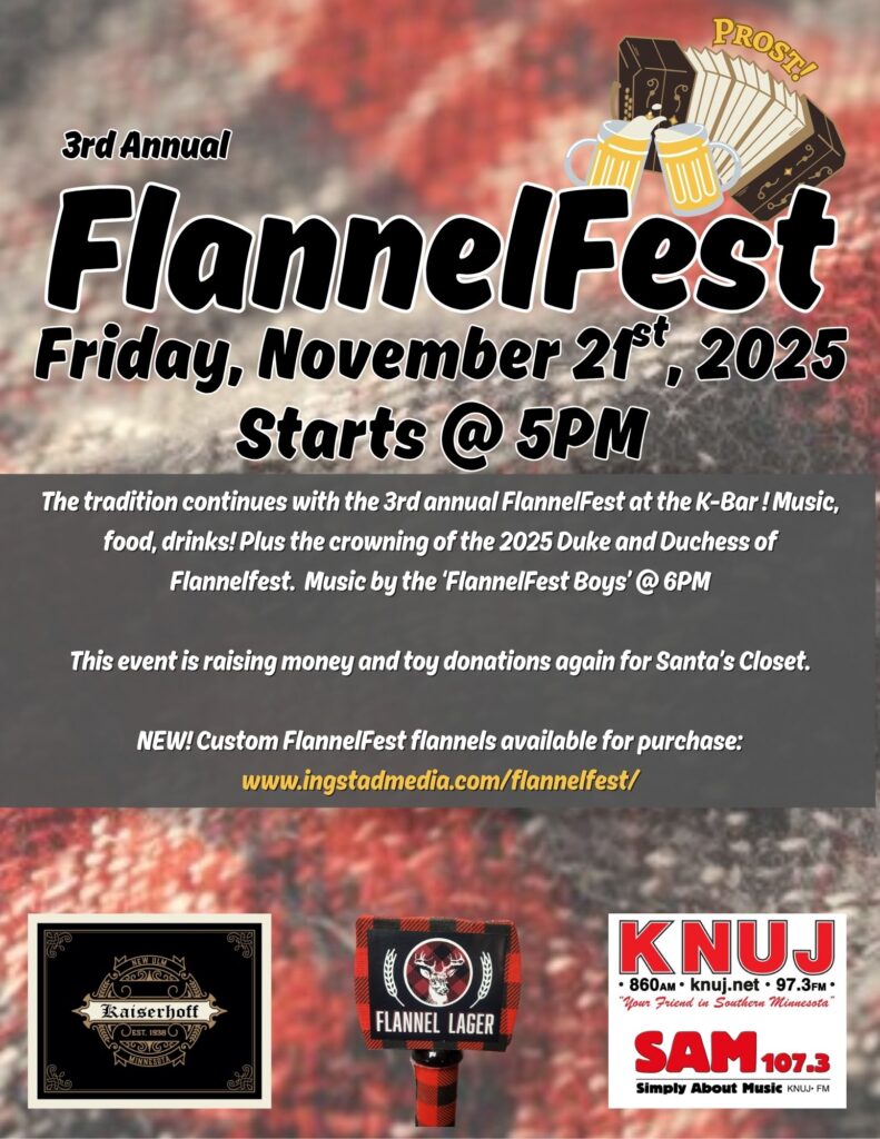The tradition continues with the 3rd annual Flannelfest at the K Bar on November, 21st! Music, food, drinks plus the crowning of the 2025 Duke and Duchess of Flannelfest. This event is raising money and toy donations again this year for Santa’s Closet.