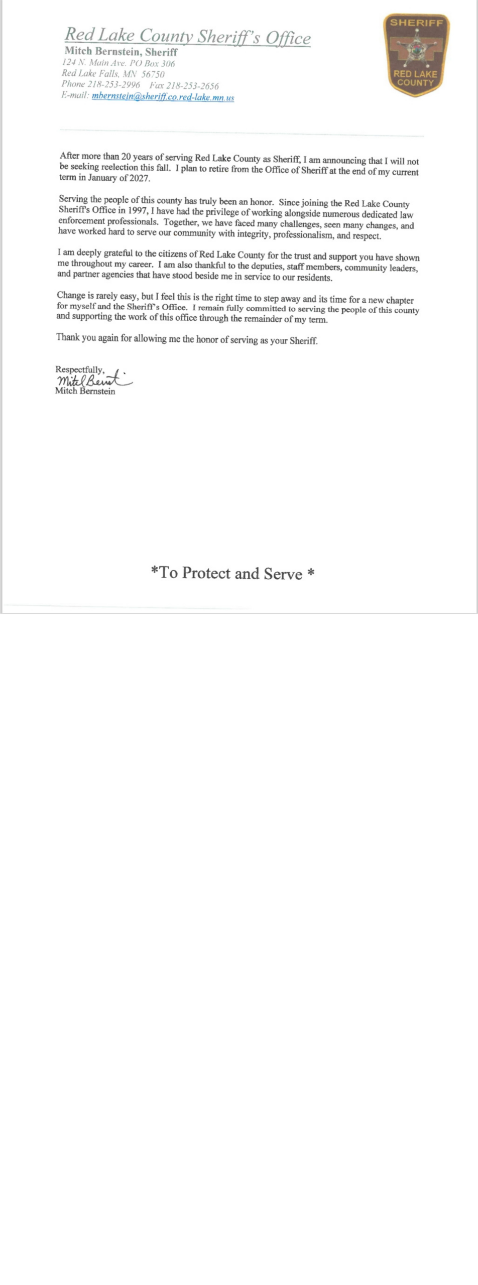 Red Lake County Sheriff Announces retirement