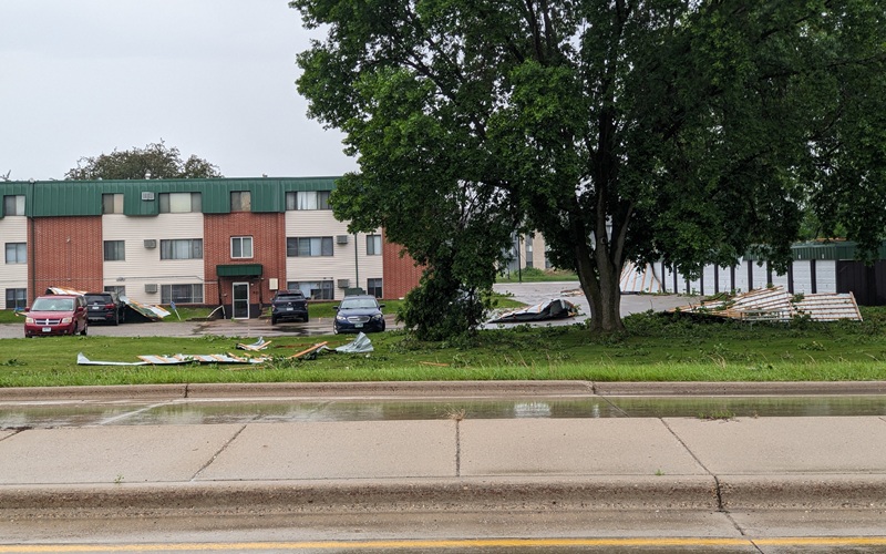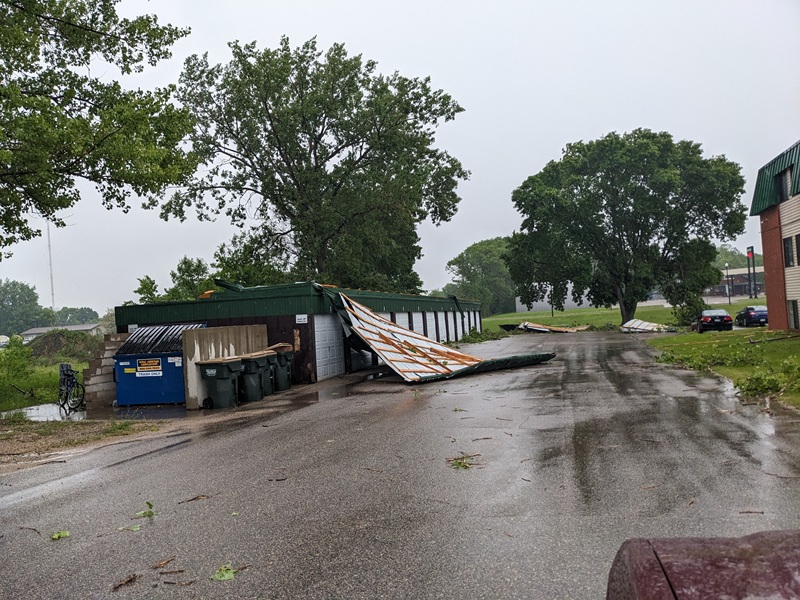 In McLeod County, the roof was blown off the garage at the Parkwood Apartments Golden Oaks on the north side of Hutchinson, a portion of which landed on a vehicle. See photos below.