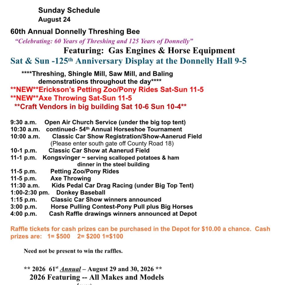 The Donnelly Threshing Bee kicks off tonight at 7:30 p.m. with Movie on the Grounds. Saturday will see a full day of activities, starting with a pancake breakfast from 7 to 9 a.m.; the Donnelly Dash 5K and Mile runs at 7 a.m. at the Rod and Gun Club Shooting Site; a softball tournament with registration starting at 8:30 a.m.; a horseshoe tournament at 9 a.m.; a Tractorcade at 9 a.m.; Kiddie Parade at 11 a.m.; Erickson’s Petting Zoo and Pony Rides from 11 a.m. to 5 p.m.; a Bean Bag tournament at 1 p.m.; the annual Antique Tractor Pull at 1 p.m.; the Kiddie Tractor Pull under the big tent at 2 p.m.; the Big Parade and Machinery Parade at 5 p.m.; Queen Coronation on the Depot Stage at 7 p.m.; a DJ at The Place to Be at 7 p.m.; and Fireworks at Dusk.